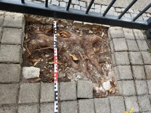Im Gutachten haben wir zunächst den Baumstandort und die vorhandenen Wurzelschäden detailliert dokumentiert. Anhand der freigelegten Wurzeln in der Einfahrt ließ sich eindeutig nachweisen, dass das Wurzelwachstum des Ahorns die Pflasterfläche und Teile des Zaunmauerwerks angehoben hatte. Gleichzeitig haben wir geprüft, wie nah diese Wurzeln am statisch wichtigen Wurzelbereich des Baumes liegen und ob ein Rückschnitt ohne Beeinträchtigung der Standsicherheit möglich ist.