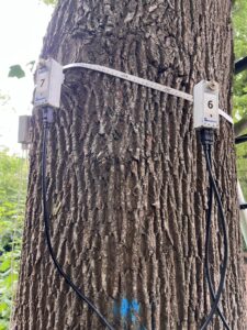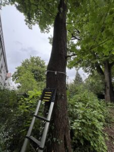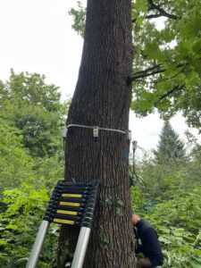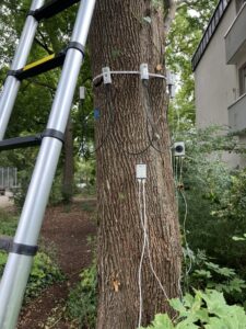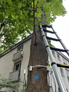 Abschließend führten wir einen Zugversuch durch. Der Baum wird dabei kontrolliert und kurzzeitig gering belastet; hochsensible Sensoren messen, wie Stamm und Wurzelteller reagieren. So lässt sich die Standsicherheit realitätsnah bewerten – gerade bei Verdachtsmomenten im Wurzel- und Stammfußbereich ist das ein entscheidender Prüfbaustein.