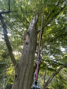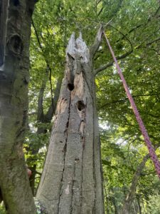 Zu Beginn erfolgte eine systematische visuelle Kontrolle des Stamm- und Kronenbereichs, ergänzt um eine faunistische Vorprüfung. Mit Drohne und Seilklettertechnik wurden alle Höhlungen erreichbar gemacht und endoskopisch untersucht. Gesucht wurden Spuren aktueller Nutzung wie Nester, Kot, frische Kratzspuren oder thermische Indizien eines Besatzes. Die Befunde zeigten unbesetzte, teils funktionsuntüchtige Höhlungen ohne Hinweise auf eine aktuelle Nutzung durch Fledermäuse oder höhlenbewohnende Vögel. Damit lagen keine Tatbestände nach § 44 BNatSchG vor; eine Fällung wäre artenschutzrechtlich zulässig.