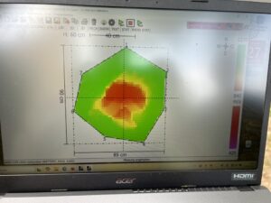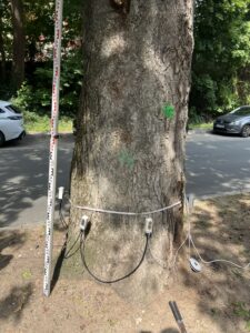 Für eine stark frequentierte Grünanlage haben wir eine Ulme mit ausgeprägtem Stammschaden fachgerecht untersucht, um die Verkehrssicherheit zu beurteilen und den Erhaltungsweg belastbar zu planen. Zunächst setzten wir eine Schalltomographie ein: Über Sensoren am Stamm wurden die Schalllaufzeiten gemessen und zu einem Querschnittsbild verarbeitet, das intaktes Tragholz, Entfestigungen, Fäulezonen und Hohlräume klar voneinander abgrenzt. Anschließend bestätigten und präzisierten wir die Befunde punktuell durch eine Bohrwiderstandsmessung. Dabei zeichnet das Gerät entlang feiner Messlinien den Bohrwiderstand auf – ein verlässlicher Indikator für Restwandstärken und die Qualität des verbleibenden Tragholzes.
